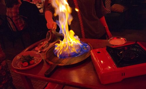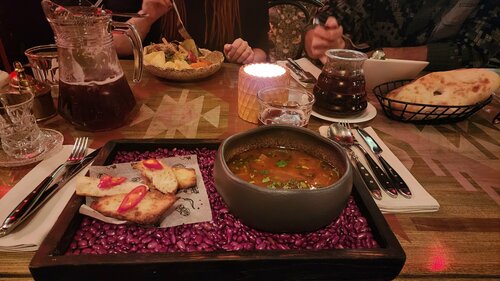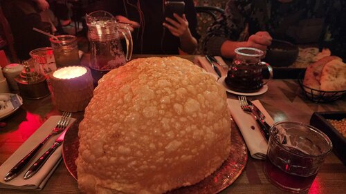 Все блюда очень вкусные, лучшая баранина которую я пробовал, воистину - ай да баран, я бы взял хинкальный абонемент. Подача - огонь (иногда - буквально).