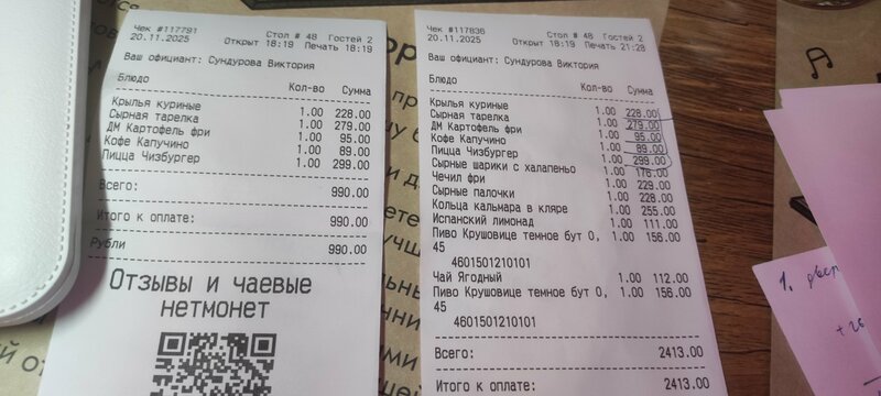 Последние разы были неприятно впечатлены обслуживанием. Бокалы для пива не считают нужным приносить, пришлось идти самим на бар. Чай обещали принести, но чайных пар не обещали... По чеку тоже была странная ситуация: девушка из нашей компании за столом пришла рано, сделала заказ и оплатила его. Мы подошли позже сделали заказ, в конце нам принесли чек, в который были включены оплаченные позиции, при просьбе пересчитать, нам рекомендовали считать самим, если нам надо...