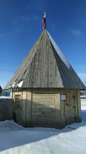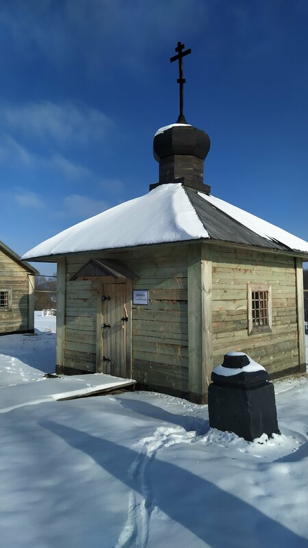 Неожиданно интересная историческая реконструкция в сельской глуши. Зимняя дорога от трассы - просто сказка! Правда, осматривать достопримечательность пришлось по занесëнным дорожкам, не чищенным от слова "совсем". Самое неожиданное - индейский тотемный столб "Юконский ворон". Память о русской Аляске...