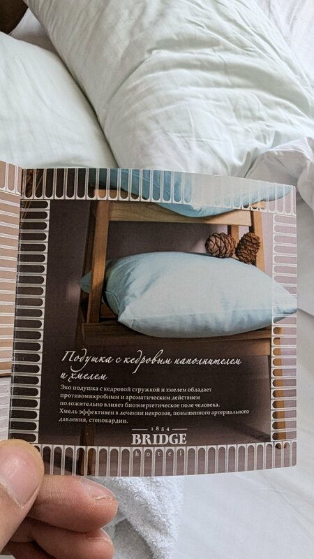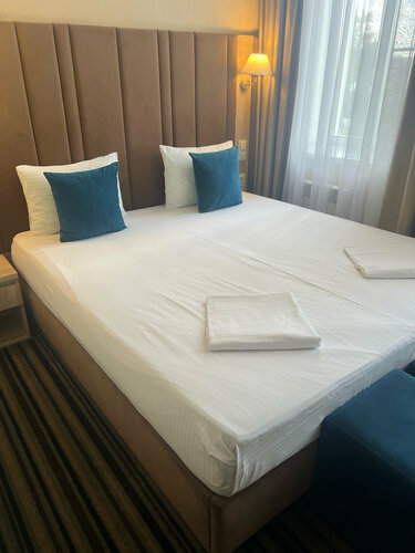 Великолепный отель в Смоленске. Останавливались в улучшенном двухместном номере, в комментариях к брони попросили окна во двор. Всё было исполнено. Номера чистые, аккуратные, как и весь отель. Парковка. Персонал чёткий и внимательный. Завтраки вкусные и сытные, несколько блюд на выбор из меню. Заказали накануне завтрак ко времени. Можно заказать в номер. Из нюансов, отель расположен рядом с мостом (название неспроста)), от которого, понятное дело, шум дороги. Мы потому и попросили номер с окнами во двор. Но, если открытые окна не принципиальны, то вообще не проблема. Звукоизоляция хорошая. Кондиционер в номере висит грамотно – холодит, но на кровати на продувает. На тумбочке заботливо лежит фумигатор от комаров, но на окнах есть сетки. Отдельно хочется отметить – меню подушек! Можно подобрать себе по вкусу. Ну прелесть же) Отель смело рекомендую!