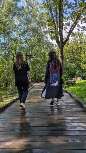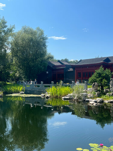 Антуражный парк для прогулки. Зелень, камни, прудики с лотосами и карпами, архитектура беседок – всё выдержано в стилистике. Парковка на территории 150 руб в час. Также на территории отель с рестораном и баром.