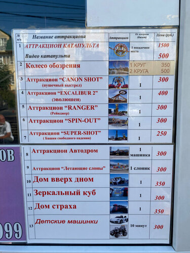 Цены невысокие, аттракционы интересные, днем не все аттракционы работают- сказали одного не покатим) сходили на те которые можно ,мы днем кинули денежку на карту ,чтобы в очереди не стоять на кассу вечером, а прийти и сразу кататься.