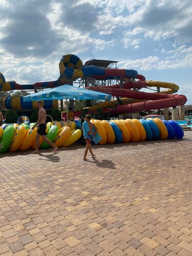 Хороший аквапарк, полотенца брали с собой, воду с собой, кафе есть на территории, цены — картошка фри 200, гамбургер 400. Начинали с горок для детей, их 2 для малышей и 6 для детей постарше, там и взрослым можно, если вес позволяет. Взрослых горок средней скорости и по стаху 4, и 4 очень страшных, 2 открытые и 2 закрытых. За 2-х детей и 3-х взрослых заплатили 10000₽. В 15:00 пенная вечеринка. Лежаков много. Территория огромная. Спасатели следят за обстановкой, охрана на входе доброжелательно встретила.