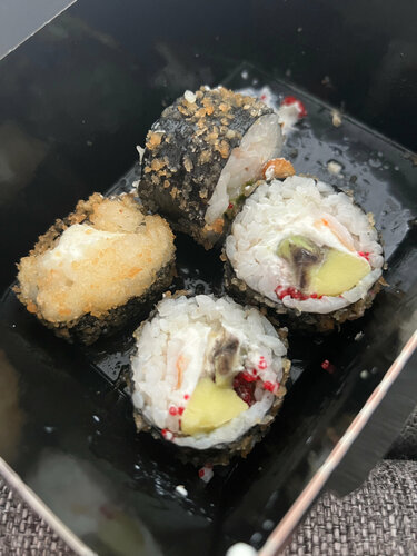 Просто жесть. Гнилой авокадо Хрустящий ролл скручен максимально плохо. Такое отдавать нельзя. И просто самый плохо приготовленный плов привезли. (Рис с говядиной и яйцом) Два часа ожидания ради ничего Закажите себе сами такое и посмотрим насколько вы будете довольны.