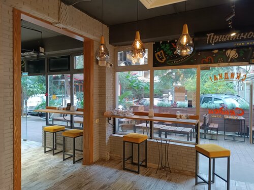 Отличное кафе с большими панорамными окнами. Можно кушать и наблюдать за тем что происходит на улице))))). Еда разнообразная, вкусная. Отдельно здесь же можно купить выпечку и кондитерские изделия. Девушки на кассе очень внимательные и вежливые. Все чисто. Прикольный интерьер. Мне очень понравилось. Насчет цен дороже чем в моем городе, но все таки Сочи курортный город. За все что на фото отдал около 650 р.