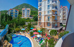 Красивая территория. Мало лежаков, дорогое кафе. И не очень безопасно спускаться с горок, очень близко расположены ступеньки, можно ноги отбить