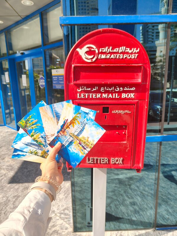 Отправляля тут открытки в декабре 25. По состоянию на начало января - одна открытка уже дошла до Италии :) Очередей нет, операторы сразу понимают, что нужно. Марки у оператора, а отправляла через красный бокс снаружи здания почты. Отправка за границу независимо от страны назначения - 3 дирхама (марка 2,1 номиналом) . Учтите, что открыток нет. Нужно покупать заранее (я заказывала ещё в России на Озоне), видела открытки в Старом городе в лавочках и в книжном в Дубай молле. Ну и на всякий случай проверяйте график работы на официальном сайте Emirates post