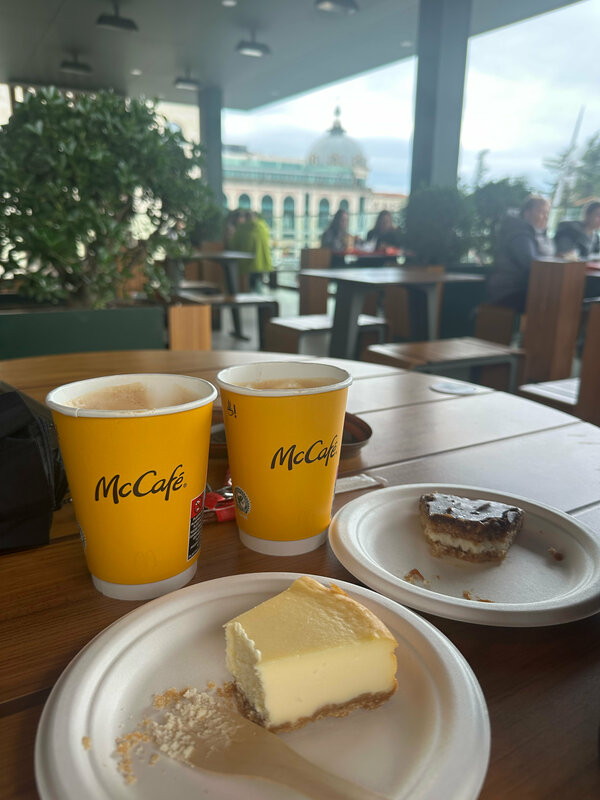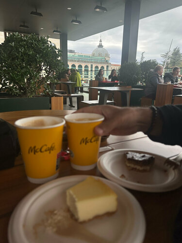 Классное место, в центре города, обслуживание чуть медленное, но местных это не смущает.)) На втором этаже открывается красивый вид на город, даже в непогоду можно сидеть на веранде и наслаждаться - тк есть подогрев сверху. Большой выбор десертов, кофе хороший, как во всех других маках)