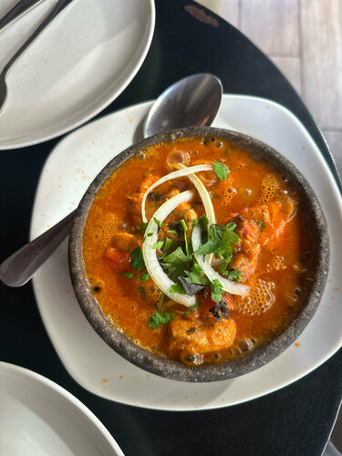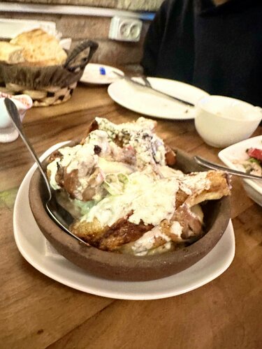 Неплохое кафе, куда местные посоветовали сходить. В первый день официанты были грубы, К третьему дню начали нам улыбаться и разговаривать более дружелюбно 🤷🏽‍♀️ На завтрак готовят хороший омлет (правда во второй раз он был уже совсем другим/безвкусным, к сожалению). Хинкали вкусные стабильно. Салат с грецкими орехами принесли прокисший, с какими то привкусами и запахами. Чкмерули - не знаю какая по размеру была курица (по ощущениям, как перепёлка), ибо были одни кости и минимум мяса на этих костях, которое было прожжено:( и за это блюдо мы отдали почти 40 лари(!!) и это все полито соусом, который через пару минут весь выпарился.. Чашушули был великолепный все три раза, что мы заказывали. Хачапури по-аджарски тоже вкусная стабильно. Приносят заказы достаточно быстро, по вечерам полная посадка, еле нашли место, утром/в обед практически нет людей. За обслуживание берут проценты, имейте в виду) В целом, за неимением лучшего можно ходить, главное - знать, что заказывать))