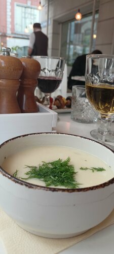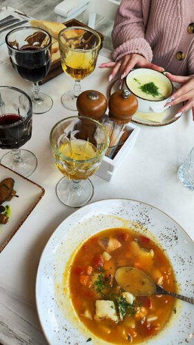 Мы пробовали только супы, но они нам очень понравились. Приятные цены на домашнее вино,жаль что нельзя купить с собой. Персонал вежливый, атмосфера приятная.