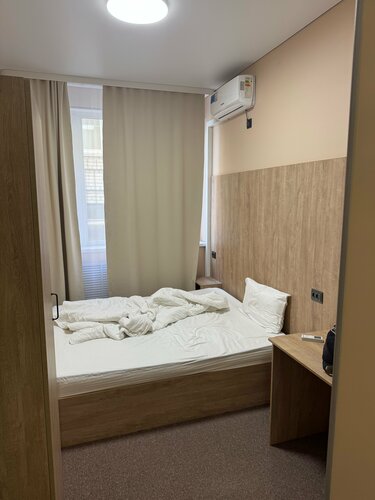 Отделка свежая, есть парковка за шлагбаумом. Номер с ковролином который не пылесосили наверное очень давно (тапочек при этом нет). Простынь мятая и с волосами как будто не меняли. Находиться на 3 этаже в старом здании. В туалете все время шумит очень громко канализация и скорее всего будет соседей. Не советую к ночлегу.