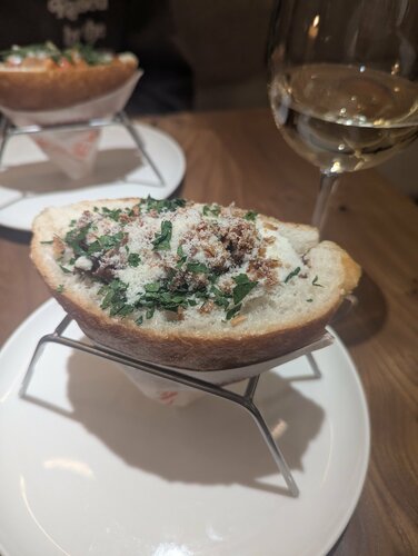 Давно хотела зайти в любой из Кульков, но регулярно сталкивалась с очередью на входе, а в этот раз ее чудом не оказалось! Очень необычный формат - булка с разными начинками, да еще и ее центральное блюдо заведения. Я отнеслась сначала скептически, но это действительно вкусно! Начинки реально много и она доходит до самого дна булки, если так можно выразиться)) Я взяла беспроигрышный вариант с телячьими щечками. Десерт выглядит прикольно, но ничего особенного, за эти деньги лучше взять ещё один кулек, благо начинок предлагается великое множество. Обслуживание на уровне, как в хорошем ресторане. Кстати для меня удивительно, что при такой популярности заведения там достаточно далеко друг от друга расположены столы, но оказывается в этом идея заведения, не делать его "битком", в общем парижского варианта здесь не будет. Ещё мне рассказали, что на Никитской обычно не бывает очередей, так что в следующий раз зайду туда)