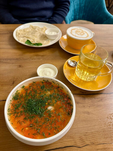 Вкусное кафе с разнообразной кухней. Есть и супчики вкусные, вареники и пельмени собственной лепки. И самое главное на чем акцентируется данное кафе это караимская кухня, чебуреки, у них называются чир-чиры. Начинки достойное количество, но вот тесто немного резиновое, туговатое. Есть зона посадки на улице, симпатичные столики. Также есть бариста и варят кофе, обычный, ничего сверхъестественного. Цены не высокие, абсолютно адекватные. У данного кафе есть 3 заведения, на Революции на набережной, и 2 по улице Фрунзе.