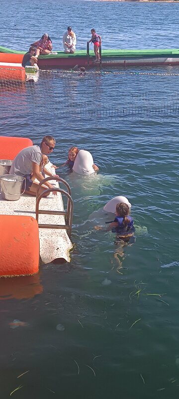 Твердая 5! Обожаем это место, каждый год заезжает на весь день. Дети смотрят тренировки животных, потом плавают на деньфинах и белухах. Нам интересно нырять на каменистом пляже, ловим крабов, видели ската. Есть детская горка и бассейн. В этом году загвоздка с питание, нет повара, но туда все едут на машине, поэтому ездили в соседнюю деревню за едой.