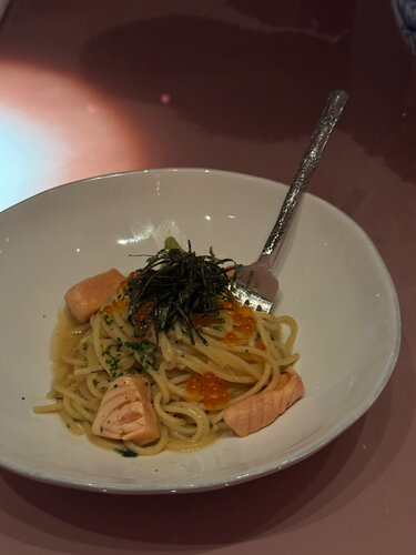Самые неоднозначные впечатления. 1. НЕ УВЕДОМИЛИ О ДОП СБОРЕ. Мы забронировали стол на 6 человек, никакого особого события не было, просто дружеская встреча. Как только мы вошли, нас огорошили, что такое количество человек у них считается как банкет, а значит нужно доплачивать сервисный сбор. С чего бы вдруг? Повторюсь, никакого праздника не было, рассади нас всех на отдельные столы по 3 человека и уже никакого сбора не было бы, потому что заказы у всех были стандартные блюдо+напиток. Хорошо, у вас такие правила, почему при подтверждении брони об этом ни словом не обмолвились? 2. НЕТ ГРАММОВОК И КБЖУ. Сейчас во всех ресторанах есть меню с расшифровкой, чтобы человек выбирал блюдо по размеру порции, ингредиентам (если аллергик) или кбжу. У нас за столом были те, кто следит за питанием, но в меню не было никакой информации о составе блюд. Вы скажете: «ведь можно расспросить официанта». Можно, но позиций в меню далеко не 10 и выспрашивать каждую невозможно еще по одной причине (напишу ниже). Допускаю, что эта информация есть на сайте, но всем ли удобно выискивать это там? 3. ОЧЕНЬ ГРОМКАЯ МУЗЫКА. Настолько громкая, что официантка сама по 10 раз переспрашивала одно и тоже. Я бы поняла, если бы там рядом был танцпол и кто-то наслаждался музыкой. По факту, со всех сторон люди пытались докричаться до своих спутников. 4. ДОЛГОЕ И НЕКАЧЕСТВЕННОЕ ОБСЛУЖИВАНИЕ. Очень долго несли блюда, хотя посадка в зале была неполная. Пасту принесли холодной, остальные блюда более менее теплые. Двоим за нашим столом несли напиток и блюдо минут 30. Никаких извинений, просто «ваш напиток принесли за другой стол». Супер! Может предложите что-то? Нет? Ок. В сети ресторанов одного известного человека этот напиток убрали бы из счета и еще бы десерт в подарок дали, чтобы загладить. Суть даже не в чем-то бесплатном, а в заинтересованности в клиенте. Постоянно забирали столовые приборы: только отвлечешься и уже вилки как и не было, а пока дождешься, чтобы новую принесли, еда уже заветрится. В меню есть суши, но палочки никто не принес. Пасту без ложки тоже неудобно было есть. 5. ЕДА…ОБЫЧНАЯ? Еда абсолютно не впечатлила. Никто за столом не сказал, что попробовал что-то невероятное. 6. ОЧЕНЬ ТЕМНО. У некоторых за столом плохое зрение, мы сидели друг напротив друга и мало того, что не слышали, так некоторые еще и не видели друг друга😂 В общем и целом, даже второй шанс давать не хочется. За 20 с лишним тысяч можно хорошо поесть и поговорить в другом месте.