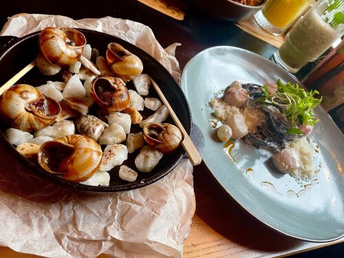 Без сомнений 10/5💔 Заведение расположилось в прекрасном месте, красиво тут все. Были в заведении 29 июня, сели в закрытом летнике (можно было расположиться на одном из открытых летних веранд или в помещении). Персонал очень доброжелательный. Наш заказ : 1 фото - лимонад малина-мята(бузина) огромный кувшин 1 литр, освежает 🔥 2 фото - Вителло тоннато, мясо вкусное, не жесткое. Соус вкусный, но я не любитель соусов из сифонов в виде пены, по мне не так соус ощущается. Я бы предпочла его в обычном виде. Руккола хорошо дополняет блюдо. 3 фото - Тартар из рыбки с авокадо и страчетеллы с хрустящей чиаботой. Это было божественно 😍Хочется повторить, нежно и сочно 🤤 4 фото - ребра с хрустящей корочкой, сочные, от малейшего прикосновения отходят от косточки, сладкий соус сводит с ума 🤤 5 фото - мидии в сливочном соусе, очень изысканный соус , не перебивает вкус мидий, а дополняет !!! 6 фото - шоколадный торт, ребёнку очень понравился, не сухой, в меру сочный.