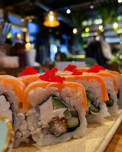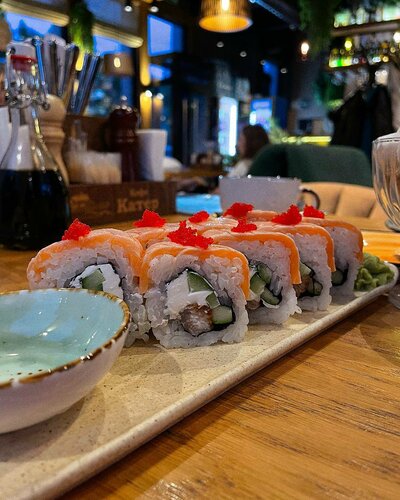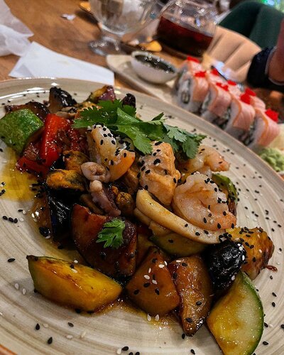 Наконец-то добралась до этого отзыва. Были в заведение 08.05.25. Очень уютное заведение, не большое кол-во посадочных мест внутри и снаружи (летом думаю виды шикарные на летниках). Обслуживание мне понравилось, официант и рассказал о блюдах, и посоветовал, и предупредил об остроте блюда. То что было не съедено упаковали с собой, большое спасибо. В заказе на троих у нас было : ✔Салат Тяхан (1фото) - с остринкой🌶 , свежайшая красная рыба, которой действительно много. Остроту сглаживает свежий огурец, перец болгарский и вкусно сваренный рис.👍 ✔Теплое море (2фото) -что-то похожее на соте, достаточно внушительная порция, морепродуктов не жалеют(мидии, креветки, лосось, порадовали щупальца малышки осьминога), овощи не убитые и приятного похрустывают, что мне очень нравится.👍 ✔Мидии в сливочном соусе (3фото) - классика, мидии хорошие, но по мне маловато соуса и я бы поиграла с его вкусом, на вкус как выпить из пакета свежие сливки без специй и соли. ✔Ролл Тайга с опаленным лососем, тут случилась любовь(фото 4-5). Тот случай, когда соевый соус не нужен от слова совсем(но он присутствует на столе и можно самим налить).Баланс нежного сливочного сыра, огурчика и угря, прекрасно "женятся" с опаленным лососем. Вкус не убивается сыром, а дополняется, во вкусе чувствуется свежая рыба, которую лишь слегка опалили. Захотелось вернуться и ощутить эти эмоции снова.👍 ✔Том Ям с морепродуктами(фото 6) - по остроте 3 из 5. Морепродуктов достаточно, не переварены, мягкие. Порция приличная. Бульон наварист и не водянист. Рис имеется.👍 -Из напитков чай вишня персик(насыщенный и приятный), к нему подали кусковой сахар и ванильный коктейль(ребенку понравился). Ценник оправдывает качество, хочется вернуться снова.