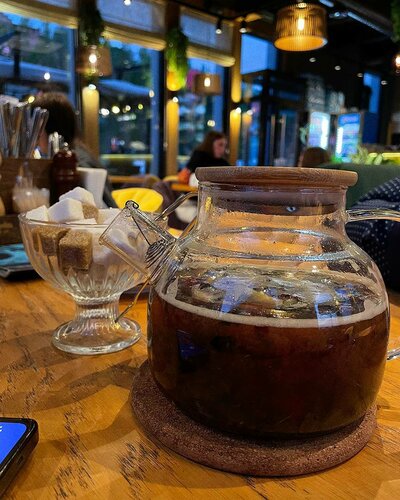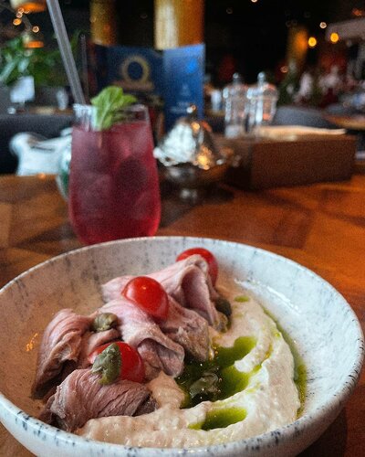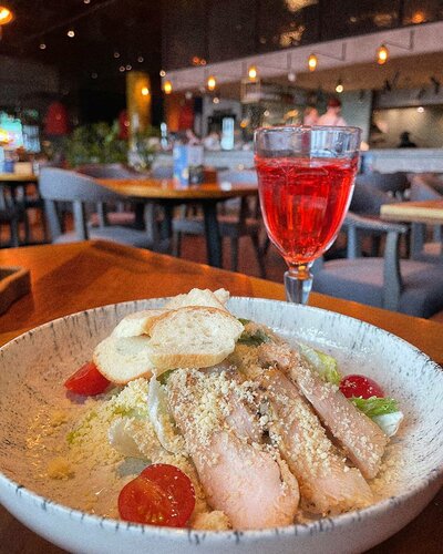 Были в заведение 08.05.25. Интерьер очень красивый, восточный мотив читается в каждой детали, много зелени, яркие акценты. Посадочных мест много, приятная музыка. Приятно было находится здесь. Если брать всю концепцию заведения, цены, быстроту отдачи блюд и гостеприимство, то 5 заслуженная. В заказе на 3 было : ✔Тартар из лосося на рисовых чипсах 390р.(1фото) :цена приятная, чипса похрустывает, как мне показалось нежный васаби соус дополняет эту картину своей пикантностью. Сам тартар слабоват, яблоко сильно заглушает вкус рыбы. Всё вместе достаточно не плохо. ✔Вителло тоннато 490 р.(2фото) - я фанат этого блюда и заказываю везде где нахожу. Соуса много, яркий вкус тунца мне понравился, но вот мясо будто переварили, жестковато и без вкуса совсем. ✔Цезарь с курицей 390р.(3 фото) - вкусный салат, мяса достаточно, сыра много добавили, яркий. ✔Том Ям со стеклянной лапшой 390р.(4 фото) - острота 2 из 5, больше кисловат, чем островат. Бульон бы хотелось по ярче, наваристее. По составу не плохо за такую стоимость. ✔Шашлык из цыпленка 390р(5фото) - вкус костра присутствует, нежное и сочное мясо(мнения разошлись, мне было хорошо, ребенку сыровато), которое дополняет капуста, морковь по-корейски и маринованный лук. Подается на лаваше. ✔Мидии по соусом "Том Ям" 490р(6 фото) - мидии мясистые, сверху начинка показалась с лишней кислинкой (видимо у них такая паста том ям, ибо в супе та же кислинка присутствовала). Из напитков брали Айс Ти смородина(освежает, но вкус слабоват) и ягодный морс хорош был. Огромное спасибо коллективу заведения, приветливые, даже поздравили с годовщиной свадьбы и подарили коробочку с рахат лукумом(уточняли при бронировании повод). Вся атмосфера заведения, да и где найдешь такие цены низкие, покрывают и сглаживают эти недочеты в блюдах.