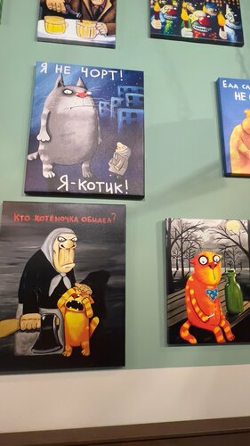 Яркое, неординарное, впечатляющее заведение!😻 Одно удовольствие рассматривать картины во время приема пищи))) Еда вкусная, а картины позитивные (их, кстати, можно приобрести)🥳 Котики очень колоритные, создают настроение))
