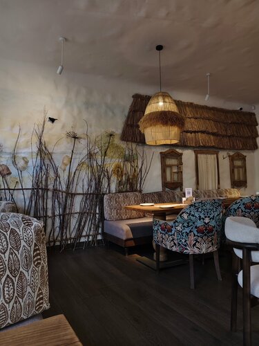 Очень нежно и вкусно♥️ Авторский десерт с киселем окунул меня в детство✨ Голубцы из свекольной ботвы тоже прекрасный.Добавленный к ним соус гармонично добавляет изюминку вкусу.Интересный интерьер и костюмы официантов добавляют особый шарм и ощущение что вернулся в хату)