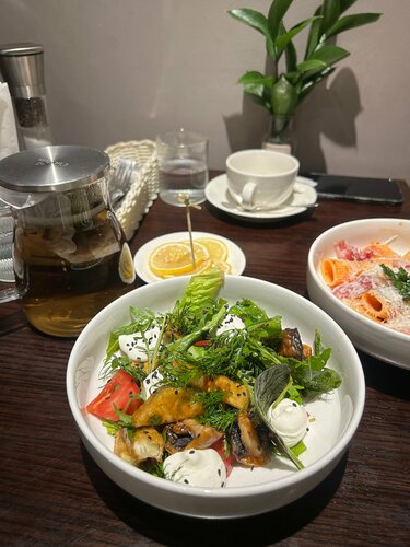 Впечатления - так себе. Душно, народу было много(типичная классика под вечер) хотели попробовать стейки, шашлыки, и ничего из этого не было в наличии, в итоге на ужин у нас были салаты, которые поклевали пару минут, а в желудке пусто 🙃 Один из них был с баклажанами , который мне очень понравился. За него звезд накину, в остальном не очень. Чай принесли остывший, тарелку с десертами пришлось выпрашивать, тк официанты не успевают обслужить.