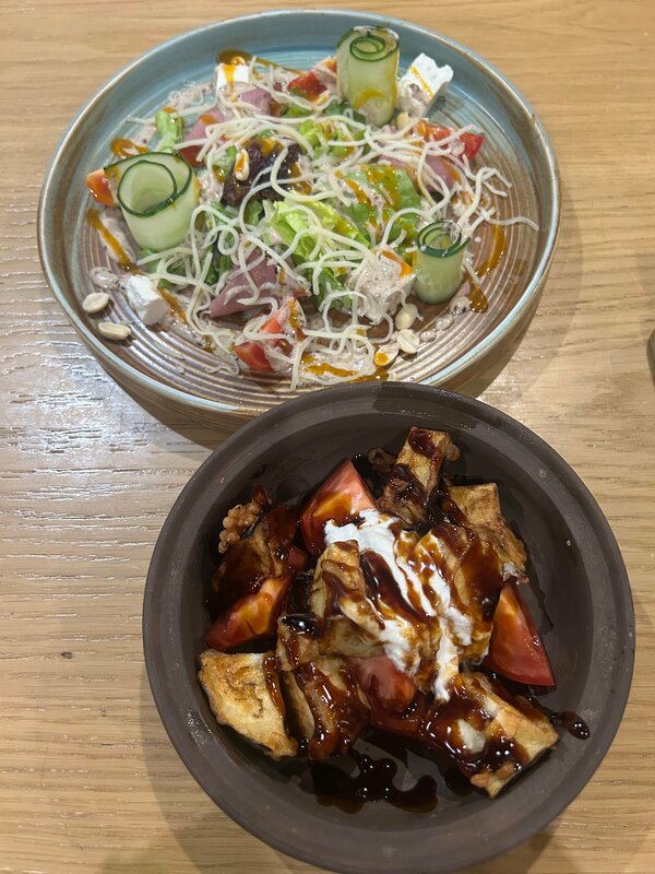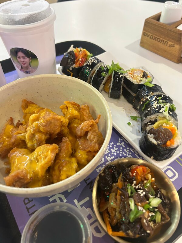 Оставшись в восторге от филиала на Баумана, захотелось опробовать еду здесь. Какое это было разочарование…панировка от курицы была настолько жесткой, чуть зубы не сломали пока жевали, кимбаб тоже ни о чем. Чай сделали без сахара, когда пошли просить пакетики, их вообще не было в наличии🫠 больше не придем.