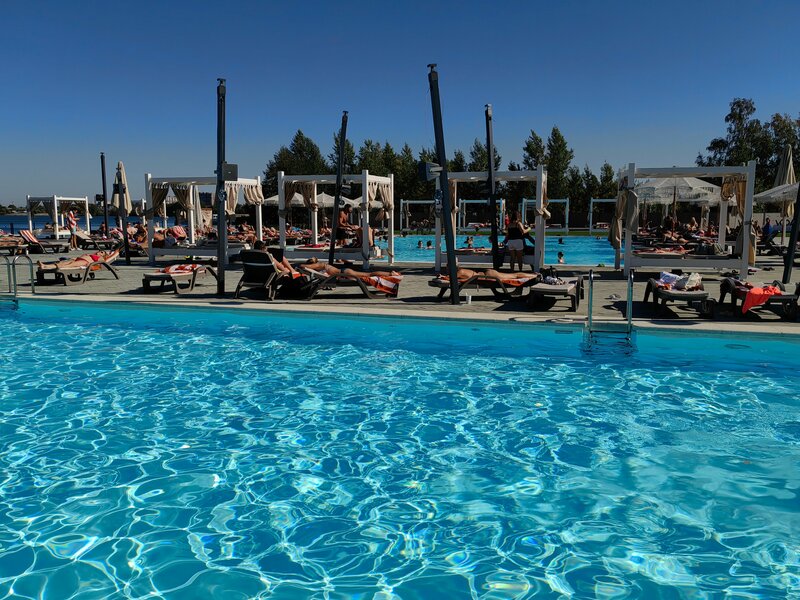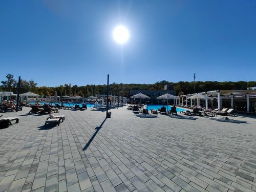 Интересное место, которое состоит из двух зон: бассейнов с инфраструктурой и и открытой площадки ресторана. На территории два бассейна, один подходит для детей и более теплый, второй - с глубиной побольше. Вода в бассейнах приятная, запаха хлорки нет. Вокруг бассейнов - шезлонги, есть несколько раздевалок, туалеты, работает бар. Территория ухоженная. Прямо за бассейнами - небольшая набережная, откуда открывается красивый вид на водохранилище. Виды действительно впечатляют. На территории играет негромкая спокойная музыка. У входа в комплекс можно получить полотенца, перед входом - просторная автомобильная парковка. Рядом с бассейнами работает полноценный ресторан. Некоторые блюда интересные с гастрономической точки зрения. Цены - несколько выше средних, но, на мой взгляд, оправданы. Зато вход к бассейнам стоит удивительно дешево. Есть, конечно, и минусы. В ресторане официанты порой работают очень долго. Например, счет я ждал минут 20. Так же и по подаче блюд - зависит от количества посетителей. Второй минус ресторана - это, как ни странно, сама организация отдыха. Посетители на открытой площадке курят, все это сносит на ветром на других гостей. По поводу бассейнов - рекомендую руководству поговорить с женщиной на кассе, которая выдаёт полотенца. Уж очень она неприветливая, прямо на входе несколько портит впечатление. В целом я рекомендую это место к посещению, отличная задумка и хорошая реализация.