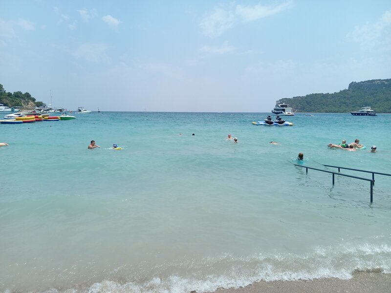 Красивый пляж. Чистый. Вид на море завораживает. Из-за того что мы были из другого отеля, нам вход был платный 350 лиры на человека. А в другом кафе этого же пляжа было 450 лиры/чел.