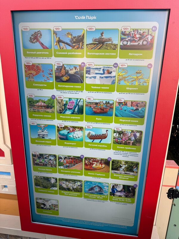 Специально приехали на выходные в Сочи 22-23 ноября покататься на аттракционах. Заранее посмотрели на сайте информацию, что всё работает в штатном режиме. В итоге, оказалось, что из взрослых экстремальных аттракционов работает только пара-тройка. Считаю, что о таком надо писать на сайте большими красными буквами, чтобы люди не тратили свое время и деньги. В остальном парк приятный и ухоженный. Персонал вежливый и только за это добавляю звезд.