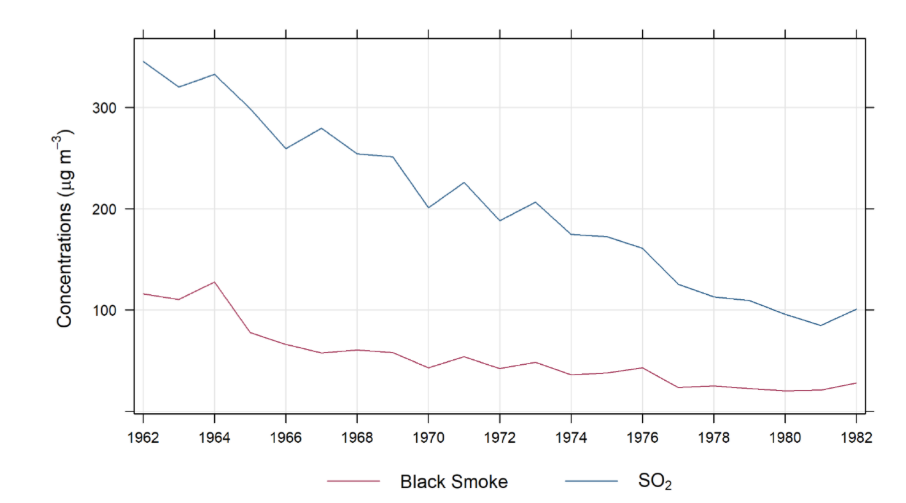 Этот график показывает, как падала концентрация вредных веществ в лондонском воздухе в районе Вестминстерского дворца (где живёт королевская семья) через несколько лет после того, когда начал исполняться Закон о чистом воздухе. Концентрация диоксида серы и дыма резко снизилась с середины 1960-х годов.